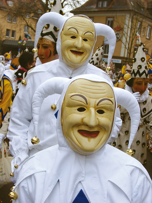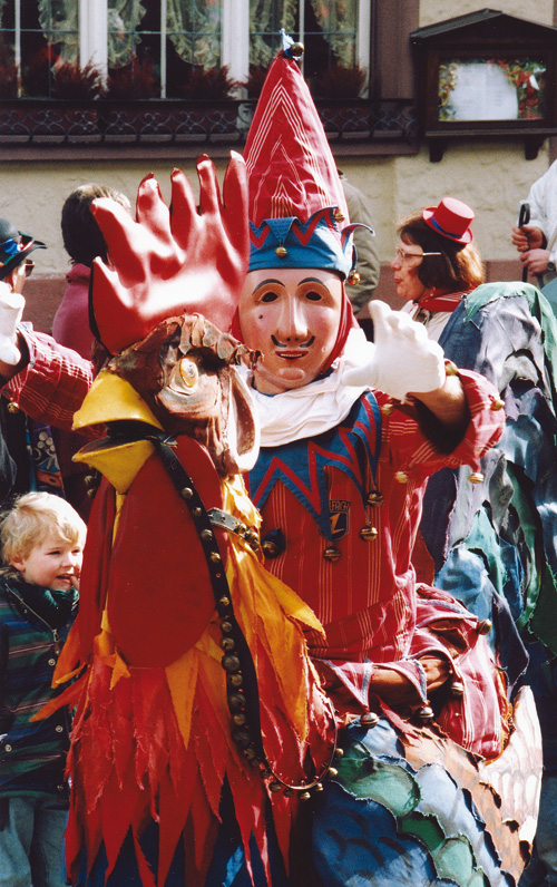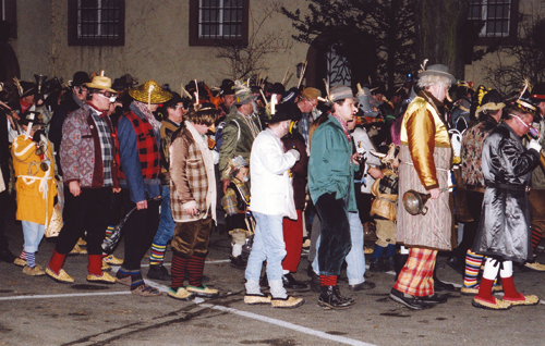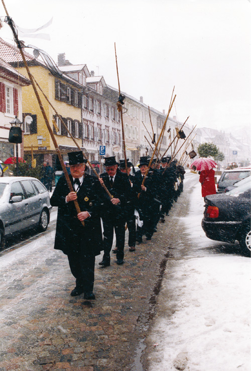 Eine Nase schöner als die andere Der letzte Umzug vor Aschermittwoch, der Nasenzug, beginnt vor dem Schlosstor. Kurz bevor das Tageslicht allmählich schwindet, treffen sich um die dreihundert Männer; sie tragen keine Masken, sondern setzen lediglich eine Nase auf. Selbstverständlich gleicht keine Nase der anderen. Hier erkennt man Improvisationskünstler und kreative Talente aller Stilrichtungen. Auch bei den mitgeführten Krachinstrumenten stammen die allerwenigsten aus der Musikalienhandlung. Frauen und Mädchen ist es nicht erlaubt, an diesem Umzug teilzunehmen. Sollte dennoch eine erwischt werden, wird sie in den eiskalten Stadtbrunnen geworfen. Die Männer und Buben tragen ihre Kittel „lätz“ herum, also mit dem Futter nach außen, und am Hut einen schlichten Holzspan. Als Gürtel dient ein einfaches Seil, mit dem sich manche aneinander binden, um Verirrungen zu vermeiden. Denn jetzt bewegt sich ein langer Gänsemarsch im Zickzack und Mäander durch sämtliche Winkel, Gassen und Gaststätten der alten Stadt an der Kinzig. Nach etwa zwei Stunden ohne Halt treffen die inzwischen von einer eigenartigen Stimmung erfassten Teilnehmer am alten Lindenbaum im Schlosshof ein; in der Dunkelheit umkreisen sie ihn in einer großen Schnecke. Der Nasenzuganführer animiert sie, ihre Freude über die Fasnet hinauszujubilieren. Die alten Wolfacher Fasnetssprüche werden noch einmal inbrünstig deklamiert. Dann weist er sie allerdings darauf hin, dass die Fasnet bald „e Loch hot“. Seufzen und Wehklagen lässt das gestandenste Mannsbild durchzittern. Doch der Umzugsanführer entlässt die „Nasen“ nicht ohne Hoffnungsschimmer: Ab morgen „goht’s scho wieder degege“. Na, wenn das keine Perpektive ist. Schwarz befrackt in tiefer TrauerEigentlich sollte am Dienstagabend alles vorüber sein. Doch am Aschermittwoch treten noch rund zwanzig Männer in Frack und Zylinder in Aktion: die Geldbeutelwäscher. Um 13 Uhr erscheinen sie aus dem Wäschergässle neben dem Rathaus. Jeder trägt eine lange Stange hoch aufgerichtet vor sich her, an der ein leerer Geldbeutel und eine Wurzelbürste hängen. Stumm und mit ernsten Gesichtern trotten sie hintereinander her zur Klagemauer am Finanzamt. Dort lehnen sie ihre Stecken und sich selber an die Mauer und heben zu jammern an. Im Stadtbrunnen waschen sie dann ihre leeren Geldbeutel und hängen sie zum Trocknen auf. Ein Bild des Elends, wie sie tränenüberströmt einander schluchzend um den Hals fallen, sich ihrer Liederlichkeit der vergangenen Tagen bewusst werdend! Und zu all dem macht ihnen anschließend in der „Krone“ der Oberwäscher noch ganz fürchterlich „den Rost herab“. Erst nach der Standpauke gibt’s die Stockfische. So geläutert und gestärkt sind die Herren in der Lage, beim Empfang durch den Bürgermeister die Rathauspolitik stockfischgesalzen zu kommentieren. Damit geht die Fasnacht auch in Wolfach wirklich zu Ende. Das Oberhaupt der Narrenfamilie Anders als in anderen Orten wacht in Wolfach nicht ein Zunftmeister über das Spektakel, sondern der Narrenvater zusammen mit dem Kleinen Narrenrat; und anders als bei anderen Zünften erhebt die „Freie Narrenzunft Wolfach“ keine Beiträge und führt keine Mitgliederlisten. Der Volkskundler Werner Mezger, der die Zunftmeister mit einer Regierung vergleicht, schreibt über die Wolfacher Verhältnisse: „Wo kein eigentlicher Verein ist, gibt es auch nichts zu regieren. Für Leute, die sich jedes Jahr nur locker wie eine große Familie zusammentun, um Fastnacht zu machen, genügt (...) ein Familienoberhaupt.“