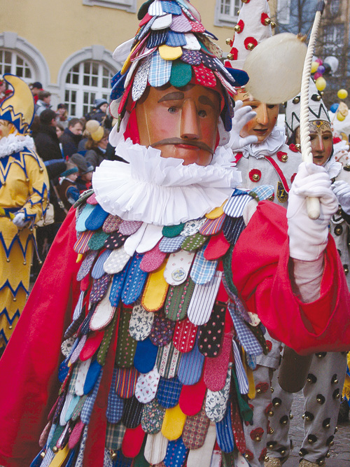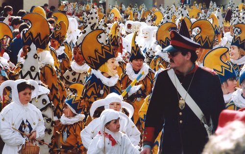 ... und sehr, sehr lang Mit zwölf Umzügen durch die Wolfacher Fasent von Wilfried Schuler Dass die Wolfacher Narren die Fasnachtszeit nicht optimal nutzen, kann niemand behaupten. Sie bringen es innerhalb von sechs Tagen auf zwölf Umzüge – mehr Straßenfasnet geht nicht! Dabei haben die Wolfacher zu Beginn der närrischen Tage, beim Fasnetsausrufen, schon einiges hinter sich. Denn sie feiern bereits die Vorfasnet ausgiebig. Der fastnächtliche Überschwang scheint in Wolfach Tradition zu haben – immer wieder im Laufe der Jahrhunderte versuchte die strenge Obrigkeit die Bewohner der Schwarzwaldstadt von ihren Narrenspäßen abzuhalten: 1543 wurde die Fasnet „als eine heidnische Onsinnigkeit“ untersagt, doch immer wieder schlugen die Wolfacher über die Stränge und überschritten das Verbot. Erst 1785 hatte man ein Einsehen – weniger die Narren als die Obrigkeit: Diese gestattete einigen Bürgersöhnen, sich an zwei Fasnetstagen zu maskieren. Heute müssen sich die Wolfacher Närrinnen und Narren nicht mehr zurückhalten. Die Fasnet ist im kulturellen Leben der Stadt fest verankert. Schnurren und tanzen „wie de Lumbe am Schdecke“Zwischen Dreikönig und der Fasnetswoche treffen sich die Narren zu ihren Versammlungen, besuchen Narrentreffen, freuen sich über die Orgelmänner und -frauen, die durch die Straßen ziehend das Narrenblättle verkaufen, und durchtanzen auf den Bällen die Nächte „wie de Lumbe am Schdecke“. Höhepunkte der Vorfasnet sind der Zunftabend in der Festhalle und das große Schnurren. Am Sonntag vor dem Schmutzigen werden die gas-tronomischen Betriebe zu Schnurrlokalen ernannt; sie können den Ansturm der Schaulustigen und Neugierigen kaum bewältigen. Schadenfreude und bange Erwartung halten sich die Waage, denn wie heißt ein Wahlspruch der Schnurranten: „Wer immer Dreck am Stecken hot, der fürchte heute unser’n Spott.“ Und wer weiß schon, wen es erwischt? Vor den Schnurranten bleibt nichts geheim und niemand wird verschont: „In Vers und Melodie und Reim suchen sie die Sünder heim.“ Mit dem Schnurren endet die Vorfasnet. Wolfach im Umzugsstress Wenn am Abend vor dem Schmutzigen Dunnschdig die Landsknechte ihre Fackeln entzünden, dann beginnt mit dem Fasnetsausrufen die heiße Phase der Fasnet, in der die Wolfacher und ihre Gäste zwölf Umzüge erleben werden. Mit Pfeifern und Trommlern ziehen die Landsknechte durch das Schlosstor in die Stadt ein. Sie begleiten die „Burg“, von der der Herold des Guts- und Landesherrn Graf Konrad zu Wolfach die Erlaubnis zur Fasnet verkündet. Kaum hat der Herold seine Aufgabe erfüllt, strömen die Hansel und Rungunkeln, begleitet von Kapellen und Narrenrat, hinter der „Burg“ her, als könnten sie es nicht erwarten. Nur an diesem Umzug nehmen ausschließlich Hästräger teil.