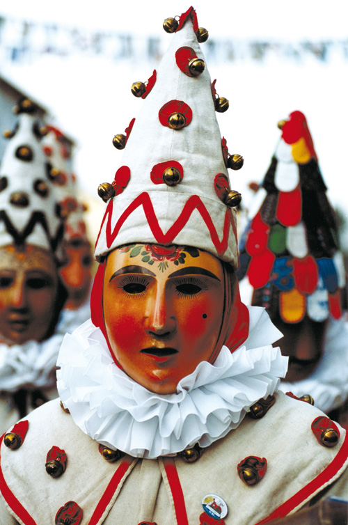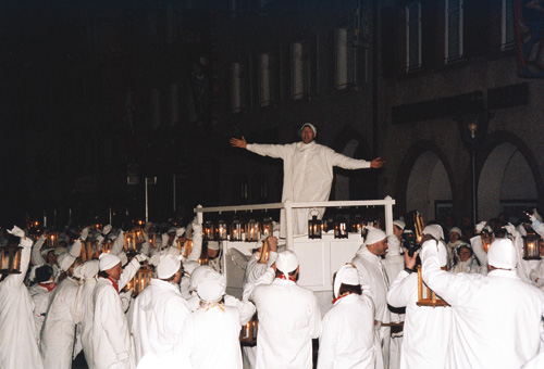 Im Bett durch die Stadt Am höchsten Wolfacher Feiertag, dem Schellenmendig, treffen sich frühmorgens Hunderte in Weiß Gekleidete vor dem Schlosstor. Sie tragen lange Nachthemden und Zipfelkappen oder Nachthauben, ihren Weg beleuchten sie mit Stalllaternen. Punkt 5.30 Uhr hebt ein infernalisches Getöse an: aus Hörnern, Pfeifen, Posaunen, mit Blechdeckeln, Stahlflaschen und Glocken, kurz: mit allem, was Krach macht. Im Zentrum der Narren im Nachtgewand liegt der Wohlaufsänger. Er ruht in seinem Bett, das auf einem Karren durch die Stadt gezogen wird. Dort, wo früher der Nachtwächter sein Lied sang, hält der Zug an. Aller Lärm und jedes Wort verstummen. Der Wohlaufsänger erhebt sich und singt: Wohlauf! Wohlauf! Noch ehe der letzte Ton verklungen ist, bricht der Höllenlärm erneut los und der Zug setzt sich wieder in Bewegung bis zur nächsten der zwölf Stationen. Nach einer weiteren Elfemess gibt es für die Wolfacher Narren kein Halten mehr. Alles strebt dem Höhepunkt der Fasnet zu, dem Festspiel! In einem Festumzug präsentieren sich zunächst die am Spiel beteiligten Gruppen und alles, was ein Häs trägt. Auf der Bühne vor dem Rathaus beginnt dann das Festspiel. Das älteste Stück wurde vor über 200 Jahren in Wolfach erstmals dargeboten, „Die Weibermühle von Tripstrill“, 1787 von Georg Anton Bredlin geschrieben. Inzwischen sind neue Fasnachtsspiele entstanden und über die Bühne gegangen; doch die „Altweibermühle“ ist immer noch ein Renner und wird alle fünf Jahre aufgeführt. Der Fasnetszieschdig ist ein Stresstag – vier Umzüge bringen selbst die stärksten Fasnachtsfans an ihre Grenzen. Kaum haben die Narren die dritte Elfemess und den dritten Kaffeetantenumzug genossen, kommen die Kinder zu ihrem Recht und ihrem Umzug. Am meisten freuen sie sich auf den Brezelhans, eine meterhohe Hanselfigur, die über und über mit Brezeln behängt ist. Nach dem Umzug verteilt der Narrenrat Brezeln und Wurst an den närrischen Nachwuchs.