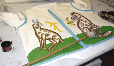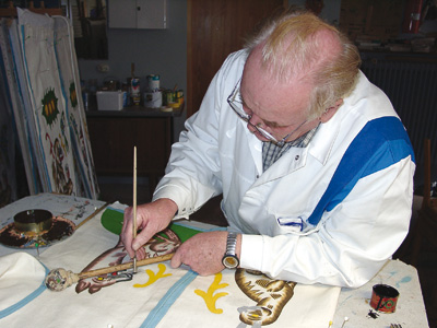 Der Grundstoff jedes Villinger Narrohäses ist reines Leinen. Gefordert ist eine besonders feste Qualität, die heutzutage nicht leicht zu bekommen ist und in größeren Mengen abgenommen werden muss. Beim derzeitigen deutschen Lieferanten der Narrozunft Villingen, bei dem die Leinenstoffe aufgrund der besonderen Webart noch auf alten Webstühlen gefertigt werden müssen, beträgt die Mindestabnahmemenge fünf Ballen, wobei ein Ballen aus ca. 20 Metern Stoff besteht. Für ein großes Narrohäs benötigt man etwa 4,5 Meter Stoff (Preis: ca. 220 Euro). Damit der Stoff nicht ausfranst, wird er vom Hersteller imprägniert, und um Fusseln zu vermeiden, die zu unschönen, kaum zu korrigierenden Farbflecken außerhalb der aufgemalten Motive führen könnten, abgeflammt. ![]() Kohlenstaub und helles Leinen Erhard Fleig bekommt das Häs fertig genäht von einer Näherin. Im ersten Arbeitsschritt legt er eine seiner in Pergamentpapier gestanzten Motivvorlagen (Schablonen), von denen er vier verschiedene Größen hat, auf den Leinenstoff – auf ein Hosenbein, einen Ärmel usw. Mit einem porösen Leinentuch, in dem sich von ihm eigens in einer Kaffeemühle gemahlener Holzkohlenstaub befindet, reibt der Häsmaler über die Vorlage auf dem Leinen und paust das Motiv auf. Nach Abnahme des Pergamentpapiers sind die gepunkteten Umrisse des Motivs, eines Hasen, eines Löwen usw., auf dem Häs zu sehen. Diese Umrisse werden mit Lackfarbe ausgemalt. Für die Feinarbeit, wie den Auftrag feiner Linien, verwendet er einen so genannten Malstock als Auflage für die malende Hand. So lässt sich der Pinsel genauer führen und die bereits aufgetragenen Farben werden geschont. Narro in gedämpften Farben Erhard Fleig mischt seine Farben aus Ölfarben und Leinöllack selbst zusammen – wobei das Mischungsverhältnis stimmen muss. Anders als bei vielen Zünften dürfen in Villingen nur die alten, schon früher gebräuchlichen Lackfarben benutzt werden. Diese nutzen sich zwar leichter ab als moderne Textilfarben; doch sie verleihen dem Stoff und somit dem aufgetragenen Motiv eine größere Steifigkeit, auch nachdem der Leinenstoff beim Waschen seine Imprägnierung verloren hat. Auch die Farbgebung ist in Villingen vorgegeben. Die Farbpalette orientiert sich an noch erhaltenen jahrhundertealten Häsern. Erhard Fleig hat alle acht verwendbaren Farbtöne plus schwarz und braun auf einem Musterstreifen zusammengestellt, der sowohl ihm als auch anderen Villinger Häsmalern als Referenz dient. Knallige Farben auf dem historischen Villinger Häs? Unmöglich. Das würdevolle Erscheinungsbild des Narro, den der Volkskundler Werner Mezger als „Highlight und stolzesten Vertreter seiner Art“ bezeichnet hat, bestimmen gedämpfte Farben. Erhard Fleig malt an einem Häs 60 bis 70 Stunden. Die Kosten dafür belaufen sich auf ca. 850 Euro. In einem Jahr verlassen etwa fünf Häser seine Werkstatt. Wenn man ihm bei der Arbeit zuschaut, so merkt man, mit welcher Routine und Erfahrung er zu Werke geht. Doch Fleig erzählt offen: Bis er das nötige Wissen gehabt habe und bis die entsprechenden Techniken saßen, habe er auch Lehrgeld zahlen müssen. Närrische Welt auf Stoff Die Motive für die Bemalung auf dem Villinger Narrohäs sind streng vorgegeben und orientieren sich ganz an standardisierten überlieferten Vorlagen. Auf dem Kittel, auch „Schobe“ genannt, ist vorne rechts (aus Sicht des Trägers) ein Hase abgebildet, links ein Fuchs. Auf der Kittelrückseite prangt ein Hansel mit leerer Dose, der einer Katze den Schwanz hochhält, so als wolle er ihr, einem Goldesel gleich, einige Dukaten abringen. Auf der Hose vorne links ist ein Bär abgebildet, rechts ein Löwe, darüber, so Fleig, eine Gruppe aus drei stilisierten, ineinander übergehenden Äpfeln, die die drei Lebensabschnitte Jugend, mittleres Alter und Greis symbolisieren sollen. Auch auf der Rückseite der Hosenbeine findet man diese Apfelgruppe, darunter rechts Hansel mit Wurst und Keule oder Narrenkolben und links Gretel, die eine Hechel in der Hand hält, ein Gerät mit scharfen Drahtspitzen zum Durchziehen und Reinigen von Flachs und Hanf. Beide tragen keine Villinger, sondern eher alpenländisch-tirolerisch anmutende Trachten, was wohl auf die vorderösterreichische Vergangenheit Villingens (1326–1805) zurückzuführen ist. Auf der Kappe, die an der Scheme, also Maske, befestigt wird, sind schließlich die Porträts einer Frau und eines Mannes aufgemalt, die wiederum Hansel und Gretel darstellen sollen. Auf den Ärmeln sind vorne Blumen und hinten Würste abgebildet. Erstere dienen an anderen Stellen des Häses neben Ranken, so genannten Arabesken, auch als Raumausfüller. Sinn oder Unsinn Lange Zeit wurden die verschiedenen Villinger Häsmotive ausschließlich im Sinne der germanisch-mythologischen Winteraustreibungs- und Fruchtbarkeitstheorie interpretiert. Dieses Verständnis wird von Vertretern des christlichen Deutungsansatzes der Fasnacht schon seit geraumer Zeit in Zweifel gezogen. Die Geister scheiden sich beispielsweise darüber, ob der Bär nun als ein Symbol des Winters oder als heraldisches Motiv anzusehen ist oder etwas ganz anderes darstellen soll, wie zum Beispiel die Unkeuschheit. Der Hansel auf der Kittelrückseite wird unter anderem als Symbol des Aschermittwoch gedeutet, der einen „Kater“ und kein Geld mehr hat. Die Hechel der Gretel weist wohl auf das während der Fasnet in Villingen ausgeübte „Strählen“ hin, bei dem der Narr im übertragenen Sinn sein Gegenüber durch das kammartige Nagelbrett zieht, wie einst die Bäuerin die Flachsbüschel. Beim Strählen spricht der Narr den unvermummten Mitbürger, den Gestrählten, auf der Straße oder im Gasthaus an, um ihm hinter der Scheme ohne Rücksicht auf die soziale Stellung des Angesprochenen unverhohlen die Meinung zu sagen, ihn zu rügen, ihn mit der Kenntnis der einen oder anderen Begebenheit zu überraschen oder um einfach Unsinn zu reden. Verschiedene Deutungen gibt es zur Wur