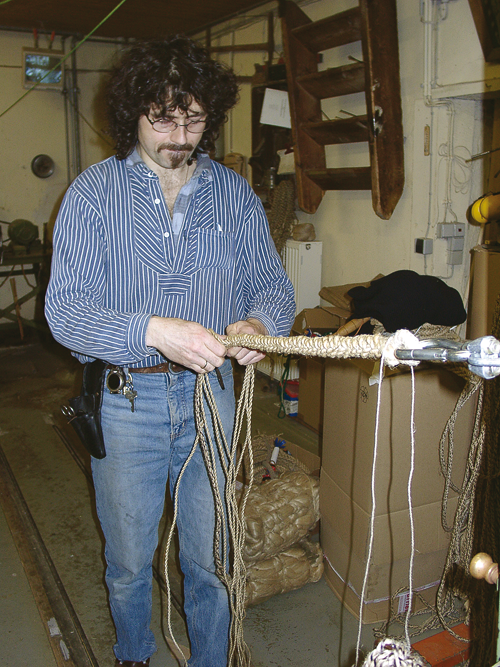 Mit einem Schmiss im Gesicht fängt’s meistens an Der sechsjährige Louis steht in Mufflers Laden. Er holt die erste Karbatsche seines Lebens, und der Großvater zahlt: 49,80 Euro für das zwei Meter lange Stück. Etwa doppelte Körpergröße ist das Maß für einen Erwachsenen. Aber manchem reicht auch das nicht. Ein Landschaftsgärtner kommt in den Laden, der will die Leine vier Meter lang haben. Er schnellt schon seit Kindertagen, „und wenn ma den Trick raus hot, noch isch des en Mordsspaß“. Anfänger allerdings fetzen sich oftmals die Peitsche ins Gesicht, dann gibt es einen bösen Schmiss in die Backe. Schnüre, Leinen und Tauwerk aller Art werden heutzutage zum größten Teil auf Maschinen hergestellt. Die laufen in der Stockacher Seilerei Tag und Nacht. Doch bei Karbatschen versagen Apparate. Bernhard Muffler bindet mit dem Schürzentuch einen dicken Bund Hanf vor den Bauch. Er hängt eine Hand voll in den drehbaren Haken, und während er rückwärts geht, wird der Haken vom Elektromotor angetrieben und dreht die Fasern zusammen. Der Seiler lässt den entstehenden Faden durch die linke Hand gleiten und gibt zugleich mit der rechten den Hanf zu, allmählich immer weniger, die entstehende Litze wird dünner. Keine Minute dauert es, und dieser Faden ist drei Meter lang. „So hot man des schon vor 3000 Johr g’macht“, sagt der Seiler.