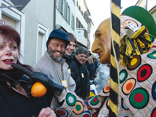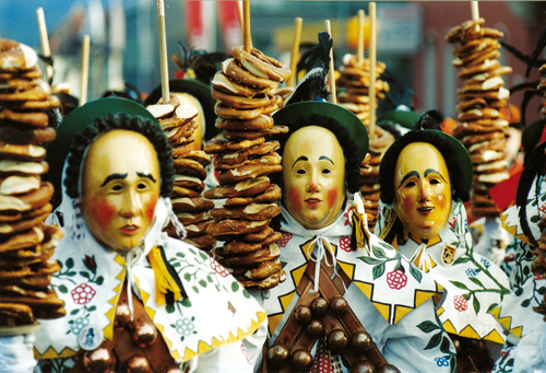 In vielen Fastnachtsbräuchen spiegeln sich die Reste des Schlaraffenlandes Von Günther Schenk ![]() Tausende von Brezeln verteilen die Narren im Schwarzwald-Städtchen Schramberg Jahr für Jahr zu Fastnacht, nicht viel weniger die in Oberndorf am Neckar. Riesige Mengen Würste bringen die Narren im Donau-Städtchen Geisingen am Fastnachtsdonnerstag unters Volk. Gleich tonnenweise werfen die Jecken in den rheinischen Metropolen am Rosenmontag Süßigkeiten aus. Und im belgischen Binche bombardieren sich ebenso wie im italienischen Ivrea die Narren zum Fest mit vielen Zentnern Orangen. Feste der Verschwendung scheinen das zu sein, sichtbarer Ausdruck einer Überflussgesellschaft, die einmal im Jahr ihr Volk beschert. Ganz kollektiv, nicht individuell wie zum Geburtstag oder zu Weihnachten. Bräuche jedenfalls, deren Herkunft tief ins Mittelalter reicht. Schon von Anfang an war die Fastnacht mit großen Gelagen und Völlerei verbunden, war sie doch die letzte Gelegenheit, vor der sich anschließenden Fastenzeit noch einmal richtig zuzulangen. Fressen und Saufen gehörten zum Karneval wie die Eier zu Ostern. Große Tafeln gab es zum Fest vor allem bei den Zünften, die größten bei Metzgern und Bierbrauern, die an den tollen Tagen besonders gute Geschäfte machten. Nach der Reform der Fastnacht in Köln traten Karnevalsgesellschaften ihr närrisches Erbe an. Und mit ihnen die Garden, die sich in der Tradition reichsstädtischer Bürgerwehren als Schutztruppe des neuen Prinzen Carneval verstanden. Prinz Carneval aber war, kulturhistorisch genauer betrachtet, der gesittete Nachfolger des Herrn Fastnacht, der als Gegenspieler der Frau Fasten alles Fleischliche verkörperte und als Hans-Wurst schließlich auch den Weg ins Theater fand. Kein Wunder, dass sich die Garden an den Tagen vor Aschermittwoch ihm besonders verpflichtet fühlten und in ihren Lagern Fleisch und Würste gleich bergeweise aufhäuften. 1863 etwa berichtete ein Chronist aus Mainz von „dampfenden Kesseln, Thürmen von Brodringen, Schinken sowie ungeheuren Batterien von Zweipfünder-Flaschen.“ Schweine, Hammel oder Ochsen drehten sich an Bratspießen in den Lagern der Garden, zunächst am Rhein, später aber auch anderswo.