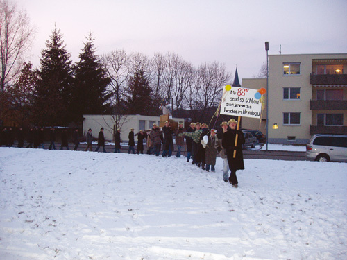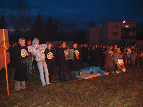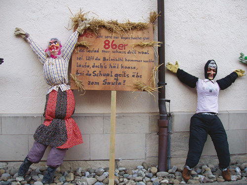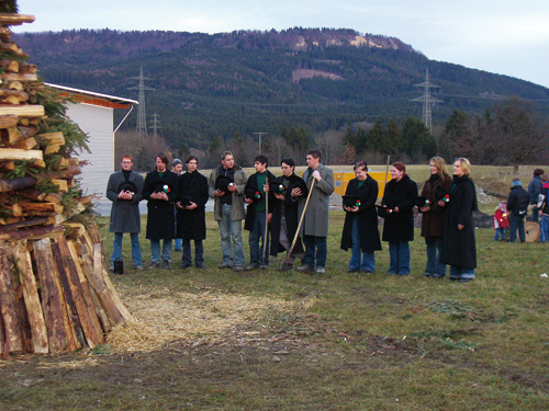 Einsatz für den Schatz Von Donnerstag bis Samstag sind sie im Wald, um das Holz für das Facklafiir zu machen. Die jungen Männer und Burschen der Jahrgänge, die um das Facklafiir ziehen werden, laden am Samstag zuvor die Mädchen ihres Jahrgangs zum Facklasonntig ein. Auch dies ist für die Jahrgänger wieder ein willkommener Anlass zur geselligen Kommunikation, verbunden mit der Einnahme eines Getränks oder auch eines Vespers. Am Morgen des Facklasonntig treffen sich die Zwanzger auf einer Wiese unterhalb des Festplatzes, um unter Anleitung eines erfahrenen Narrenrates das Facklafiir aufzubauen. Eine schweißtreibende Arbeit, bei der viele Raummeter Holz sorgsam zu einem fast haushohen Scheiterhaufen gestapelt werden. Schmutzig ist die Aktion ohnehin. Wenn der Boden nicht mehr gefroren ist, steht man knöcheltief im Matsch. Aber ein schönes Facklafiir ist der Stolz des Zwanzger-Jahrgangs. Das Facklafiir wird zelebriertWenn die Zeit Richtung Betzeitläuten voranschreitet, sammeln sich die Jahrgänge ab den Fünfzehnern bei der Kirche. Jeder Jahrgang hat eine oder mehrere Strohpuppen dabei, die nacheinander in das Fackelfeuer geworfen werden. Manchmal spielt ein Jahrgang dem anderen einen Streich und stiehlt die Strohpuppe. Sobald aber eine Strohpuppe an der Kirche lehnt, ist das Stehlen verboten. So schreibt’s die Tradition vor. Zum ersten Mal dürfen die Fünfzehner, die Entlassschüler, von der Kirche zum Facklafiir und um das Feuer gehen. Ihnen wird von den Zwanzgern beim Bau der Strohhexe geholfen. Und sie werden auch beschützt, damit ihre Hexen nicht abhanden kommen. Hut ab zum Gebet Die Bevölkerung pilgert hinaus zum Holzstoß, um am Facklafiir teilzuhaben. Schlägt die Kirchturmuhr zum Betzeitläuten um 18 Uhr, setzen die Zwanzger draußen auf der Wiese ihre schwarzen, mit bunten Wollrosen verzierten Hüte ab und beten den Englischen Gruß. Kaum ist das Amen verklungen, beschütten die Zwanzger den Holzstoß mit Benzin oder Petroleum und zünden ihn an.