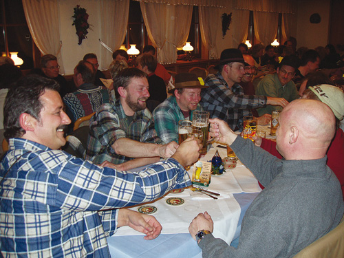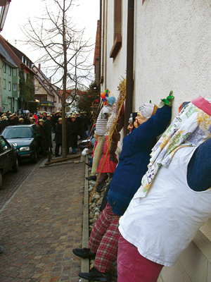 Zum Schluss geht man „ge ei’kehra“ Während die Zwanzger die ganze Nacht über das Feuer bewachen und ein letztes Mal „g’heerig oan nei lassat“, treffen sich alle Jahrgänge in den verschiedenen Gaststätten Schömbergs zum Schmaus. Noch einmal prostet man sich kräftig zu. Oft spendiert ein Jahrgang dem anderen einen Stiefel voll Bier. Und mit diesem Abend ist auch in dem alten Narrenstädtle Schömberg am Fuße des Plettenbergs die Fasnet endgültig aus! |