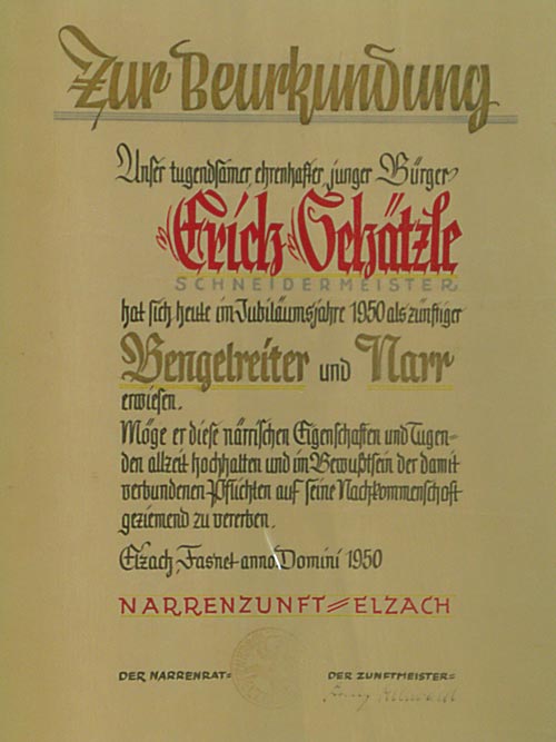 für seine alte Fastnachtstradition. Die Schuttige mit ihrer Maskenvielfalt sind auch weit über das Elztal hinaus ein Begriff. Weniger bekannt ist der Elzacher Brauch des Bengelreitens. Dieses findet alle sieben Jahre statt – das nächste Mal nachmittags am Fastnachtsmontag 2006. Es ist ein alter Brauch der Handwerkszünfte, dem zum Beispiel in Sigmaringen, Scheer und Haigerloch vorkommenden Bräuteln nicht unähnlich. Auf einer Stange wird der jüngstverheiratete Mann durch den Ort getragen. Doch friedlich geht es dabei nicht zu. Ledige und verheiratete Frauen schlagen sich um ihn ...