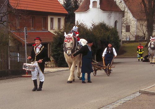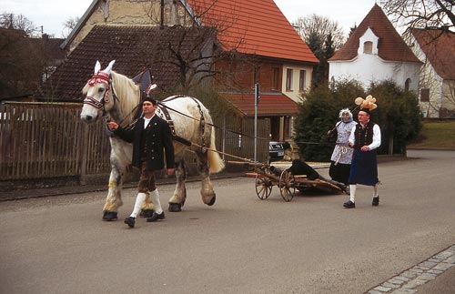 Fastnächtliches Pflugziehen mit Verspottung der ledigen Frauen, ähnlich, wie es heute noch in Trillfingen bei Haigerloch zu sehen ist.
