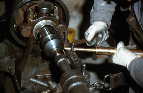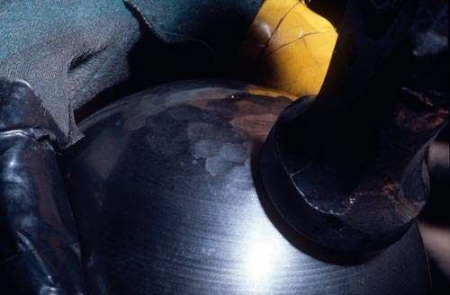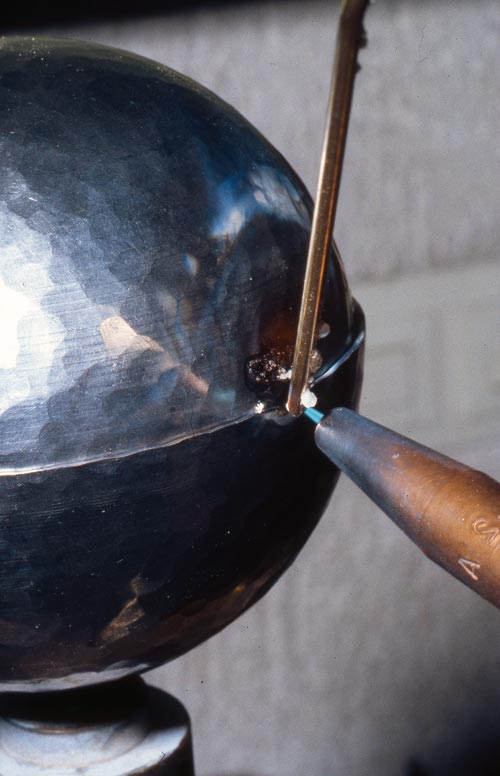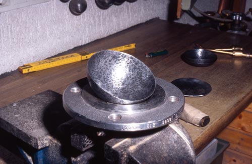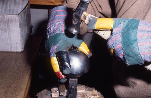 Für die Herstellung wurden einfache Werkzeuge verwendet, die bei jedem Flaschner in der Werkstatt vorhanden waren. Mit einem Zirkel wurde ein Kreis in das Blech geritzt und mit einer Blechschere ausgeschnitten. Zum Treiben der Halbkugeln verwendete man zuerst einen Holzklotz, in dem ein Loch war, später ein Rohr oder einen Flansch aus Metall, dann ein Gesenk (das ist ein Metallteil, in das eine Innenhalbkugel eingearbeitet ist). Das zugeschnittene Blech wurde mit einem Polierhammer (Fläche leicht rund) in das Loch getrieben, das heißt durch viele hundert Schläge in die Form einer Halbkugel gebracht. Durch das Treiben wird das Material verdichtet und hart. Um zu verhindern, dass es bricht, wurde es drei- bis viermal in der Esse und später mit einem Lötbrenner ausgeglüht und wieder weich gemacht. Die Oberfläche außen war fast glatt, sie hatte nur leichte Unebenheiten durch das Treiben von innen. Anschließend wurde in die größere Halbkugel eine Aussparung gemacht, um den Halter zu befestigen.
