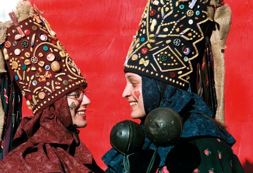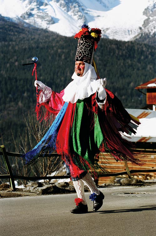 Ein großes Bild Apollonias hängt in Dosoledos Kirche, einem Ortsteil von Comélico. Dafür aber hat heute kaum einer einen Blick. Denn am Festtag der Märtyrerin richten sich alle Augen auf zwei Burschen mit großen, kiloschweren Hüten. Auf Laché und Matazin, die Anführer der Festgesellschaft. Was Prinz und Prinzessin im rheinischen Karneval, das verkörpern die beiden in den Dolomiten. Sie sind das Aushängeschild des jährlichen Mummenschanzes. Zeremonienmeister eines Festes, das schon frühmorgens mit ihrer feierlichen Einkleidung beginnt. Sekt und süßes Konfekt gibt es für die Zaungäste, schließlich nimmt man Apollonias Festtag in Dosoledo wichtiger als Ostern und Weihnachten zusammen. Kurz vor zehn Uhr machen sich die närrischen Helden auf den Weg, begleitet von einem Dutzend Possenreißer. „Pajazi“ heißen sie die Einheimischen, Bajazzos, vom ersten Frühschoppen beseelte Lustigmacher, die zielsicher die kleinen Bars im Ortskern ansteuern. Beim Tanz vor dem Tresen lassen Laché und Matazin erstmals ihre bunten Röcke fliegen, beflügelt von mit Minze versüßtem Grappa, einer Spezialität zum Festtag.