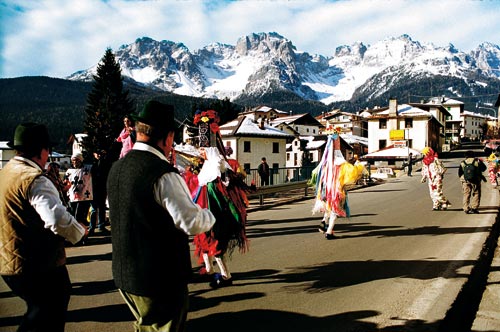 Gut und Böse zeigen sich so beim Umzug in Dosoledo. Freude und Leid verkörpern sie, Armut und Reichtum, aber auch Winter und Sommer. Gegensätze, die das Leben erst ausmachen. Ziel aller ist die Piazza Tiziano, der große Platz vor der Kirche, wo die Musiker schließlich zum Tanz aufspielen, zum großen finalen Reigen. Jeder tanzt jetzt mit jedem. Die schöne Bäuerin mit dem Teufel, die alte Hexe mit dem jungen Alphirten. Einmal im Jahr steht die Welt so Kopf, vermischen sich Realität und Fantasie im Zeitraffer auf dem Dorfplatz. Nach dem Mittagessen wiederholt sich das Spektakel, ziehen die Narren noch einmal durchs Dorf. Wieder wird getanzt und gelacht, beseelen Grappa und Glühwein die Lebensgeister. Pfarrer und Teufel sind längst einer Meinung. Und auch die Hexen wissen, was sie an ihrer Heiligen haben. In Apollonias Namen wird Glas auf Glas geleert, beschließt Dosoledo seinen höchsten Feiertag. Und natürlich lassen Laché und Matazin ihre bunten Röcke noch manches Mal durch die Luft fliegen. www.comelicosappada.it |