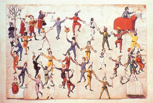 2. die dargestellte und 3. die persifliert. Sie offenbart sich im Tanz allgemein. Wir hören Musik, sehen und fühlen, riechen und schmecken den (Tanz-) Partner. Durch starke Bewegung entsteht Körpergeruch und der enthält bekanntlich Sexualduftstoffe. Durch die Art der Bewegung beim Tanz und durch die bloße Nähe im Zusammenwirken mit den bereits genannten Sinneswahrnehmungen entsteht eine erotische Komponente, die durch den, die Hemmschwelle herabsetzenden Genuss von Alkohol noch gesteigert wird. Traditionelle Narrenfiguren stellen jedoch auch gestisch das symbolische Liebesspiel dar. „Ehestandsbewegungen“ werden die rhythmischen Vor- und Rückbewegungen des Beckens und der Hüfte während des tänzelnd vollführten Narrensprungs der Schellnarren aus Wilflingen im Hohenzollerischen genannt. Mit dieser Bewegung bringen die Narren ihre vier bis sechs horizontal um den Bauch gebundenen Glockengürtel zum Klingen. Das persiflierende Geschlechtsspiel stellen Laggescheller und Laggeroller beim Imster Schemenlauf als Pedant zu den kraftstrotzenden Scheller- und Rollerpaaren dar. Schaubrauch Der Tanz, sowohl als repräsentatives Schaubrauchtum, als auch als paarbezogenes, individuelles Phänomen, ist ein wesentliches Element schwäbisch-alemannischen Fastnachtstreibens. In den Städten des Mittelalters pflegten die Mitglieder verschiedener Berufsgruppen zur Fastnachtszeit Schautänze als Repräsentationsbrauchtum. Früheste Belege für diese vorgeführten und einstudierten Tänze findet man 1397 in Nürnberg. Damals waren es die Metzger, die aufgrund ihres Verdienstausfalls in der Fastenzeit das Privileg zur Aufführung des „Zämertanzes“, eines Kettentanzes, erhielten, bei dem eine lederne Wurst als Bindeglied zwischen den Tänzern diente. B egleitet wurden sie von zwei Pferdeattrappenreitern, wie sie noch heute als Narrenfigur in etlichen Gemeinden anzutreffen sind. Die Wurst als Tanzgerät – welche Verbindung man zur Fleischlichkeit der Fasnachtstage auch ziehen mag – findet noch heute Verwendung: Die Schömberger Fuchswadel benützen ebenfalls eine lederne „Narrenwurst“ beim Narrensprung und bei der Narrenpolonaise. Da bei den meisten Schwert- und Reiftänzen Europas Narrenfiguren eine wichtige Rolle spielen, ist der ursprüngliche Tanztermin meist in der Fastnacht zu finden. In Überlingen am Bodensee ist der Schwerttanz der ledigen Rebleute 1646 erstmals bezeugt und bis heute überliefert. Der Überlinger Schwertletanz ist ein klassischer Kettentanz, bei dem der Degen als Bindeglied von Tänzer zu Tänzer dient und dessen Höhepunkt die symbolische Scheintötung des Hänseles, der Narrenfigur, ist.