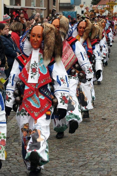 In dieser Zeit war einst der Verzehr aller Produkte von warmblütigen Tieren verboten. Eine Fleischlosigkeit im durchaus doppeldeutigen Sinn war angesagt. Im Hinblick auf die bevorstehende entbehrungsreiche Zeit wurde in den Fastnachtstagen noch einmal ausgiebig gefeiert und die von nun an verbotenen Speisen und Handlungen wurden üppigst genossen. Es wurde getrunken, gesungen, getanzt, geküsst ... Die schwäbisch-alemannische Fasnet hat sich seit dem Mittelalter in vielen Metamorphosen zu einer farbenprächtigen Erscheinung entwickelt, die um 1880 fast zu erlöschen drohte. Zu stark war die Umarmung durch den rheinischen Karneval. Doch zum Ende des 19. Jahrhunderts besannen sich die Träger der traditionellen Fastnacht, die Handwerkerzünfte in den Städten und die örtlichen Burschenschaften in den Dörfern Südwestdeutschlands, auf ihre eigenen, alten Fastnachtstraditionen und gründeten Narrenzünfte, die nun die Organisation der Fastnachtsbräuche übernahm. Seit dem Ende des Zweiten Weltkrieges zieht das Phänomen schwäbisch-alemannische Fasnet immer mehr Menschen in seinen Bann. Es begeistert und findet neue kreative Spielformen, die sich, teilweise historisierend auf die mittelalterlichen Wurzeln der Fasnet beziehen. Wichtige Bestandteile der „Fasnet“ – wie dieses überschwänglich gefeierte Fest mundartlich korrekt bezeichnet wird – sind die Maskierung und Verkleidung in überlieferten Formen. Eine hölzerne Maske und Glocken und Schellen jedweder Art gehören zu den meist aus dem Barock stammenden Narrenkleidformen zwingend dazu. Wohliges Gefühl Neben der Maskierung und Vermummung ist die Musik, und auf ihr basierend der Tanz, das dritte Element, das im Narren geradezu einen mentalen Ausnahmezustand hervorruft. Musik vermag Stimmungen und Gefühle zu entfachen und zu verstärken. Insofern ist sie kaum rational zu erklären. Jeder empfindet sie anders. Stark ist die emotionale Berührung, wenn nach fast einem Jahr zum ersten Mal wieder der Narrenmarsch erklingt. „Da läuft einem innerlich eine Träne hinunter“, so hat ein praktizierender Narr diesen Gemütszustand beschrieben. „Mentale Authentizitätsbefindlichkeit“ würde der Volkskundler dazu sagen. Für den einen mag das Klingen der Basler Piccolopfeifen nur ein schrilles, bis an die Schmerzgrenze heranreichendes Klirren in hohen Frequenzen sein. Dem anderen vermittelt dieser Klang ein wohliges Gefühl, das mit einer Gänsehaut verbunden ist und das ihm vermittelt: „Jetzt isch endlich Fasnet!“