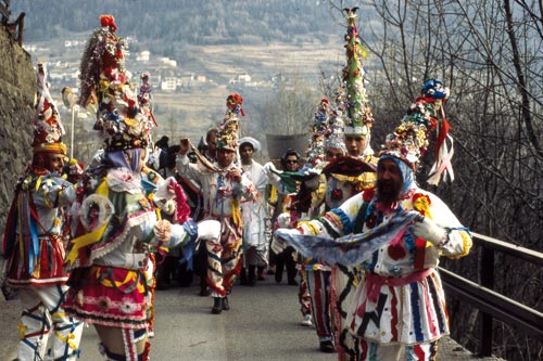 Vor jeder Tür verstreuen sie Sägemehl, säen so symbolisch Wohlstand und Gesundheit. Ein archaischer Akt, vererbt von einer zur nächsten Generation. Schließlich trifft man sich mit den übrigen Burschen und Mädchen im Wirtshaus zum Tanz, bei dem der Alte plötzlich umfällt und trotz gestenreicher Rettungsversuche regungslos liegen bleibt. Höchste Zeit für die Alte, jetzt sein Testament zu verlesen. Eine pointenreiche Lebensbeichte, die dem Alten schließlich wieder auf die Beine hilft. Es folgt ein neues Tänzchen, bei dem die Alte umfällt. Wieder wird ein Testament verlesen, haben die Gäste viel zu lachen. So geht das von einem zum anderen Weiler. Bis Sonnenuntergang, wenn die Fastnacht mit der Verbrennung der Testamente ihr Ende findet. Mit dem Dreikönigtag beginnt im Fleimstal die Maskenzeit, besuchen sich die Bewohner der 13 Weiler gegenseitig. Am Karnevalssamstag aber feiern alle gemeinsam, zieht man kreuz und quer durch Valfloriana. Matóci heißen die närrischen Helden hier. Burschen in dunklen Kitteln, mit bunten Hüten auf dem Kopf, von denen farbige Schleifen baumeln. Große Glocken am breiten Hüftgürtel künden schon von Weitem ihr Kommen. Mit ihnen sind die weiß gewandeten Arlechini unterwegs, das Gegenstück zum griesgrämigen Matóci. Große Spitzhüte tragen sie, bestückt mit Kunstblumen und allerlei Zierrat. In der Hand bunte Seidentücher, die sie beim Tanz im Rhythmus schwingen. Volkskundler wollen in ihnen das Weibliche verkörpert sehen, die Jugend und den Frühling. Für das Gegenteil, für Männliches, Alter und Winter stehen die Matóci, die beim Umzug den Arlechini vorauseilen. Wie bei den meisten alpenländischen Bräuchen ist auch im Fleimstal der Kern des Maskentreibens ein Hochzeitszug. Mit einem Mann als Braut und einer Frau als Bräutigam. Verkehrte Welt, die das Wesen der Fastnacht ausmacht. Jahr für Jahr präsentiert sich so ein bunter Haufen voller Spielwitz, der in jedem Weiler für Unterhaltung sorgt. Und natürlich kommen während des Mummenschanzes auch all die fastnächtlichen Köstlichkeiten Tirols auf den Tisch. Fettgebackenes, das man gern auch mit Fremden teilt.