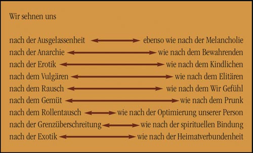 Widersprüchliche Sehnsüchte Masken und Kostüme fördern unser erwachsenes Spielverhalten. Dabei wollen längst nicht alle einmal Prinz Karneval sein. Aber alle möchten Bedeutung haben. Zumindest wünscht sich jeder Anerkennung. Nicht immer wird die uns im Alltag gewährt. Vielleicht fänden wir mehr Beachtung, wenn wir schöner, stärker, klüger, wenn wir reich und sexy wären? Oder sollten wir uns lieber dumm stellen? Wie ein Kind, das nichts verantworten muss und die Dinge laufen lassen kann. Ein dummer August hat nichts zu verlieren, und einem süßen Tollpatsch wird verziehen und geholfen. Die Wünsche nach Clown und Prinz sind nur zwei der unterschiedlichen Rollen in der Funduskiste unserer Sehnsüchte. Andere Rollen, denen wir beim Fest der Masken nachgehen, erscheinen gar gegensätzlich. Die Logik eines unlogischen Festes Was hat das nun mit der Fastnacht zu tun? Auch sie ist ein Phänomen, das nicht logisch erklärt werden kann, jedenfalls nicht mit der Logik, nach der 2 x 2 immer 4 ergibt. Das Fest der Sehnsüchte erklärt sich nicht aus der naturwissenschaftlichen Logik, sondern aus der Logik der Psyche, der Psycho-Logik. 2 x 2 ergibt auch hier immer 4. Doch – mathematisch gesprochen – stellt sich das Ergebnis mal als 5 - 1, mal als 3 + 1, manchmal auch als 20 : 5 oder als Wurzel aus 16 dar. Insofern gibt es keine eindeutige Antwort auf die viel bemühte Frage, was denn nun richtiger Karneval, echte Fastnet, wahrer Fasching sei. Feiert der Herr im Fransenkleidle, im Lappenclownkostüm oder im Smoking richtig? Trägt er Larve oder Schminke, Orden oder Pappnase? Geht die Dame als Hexe, als Alte Tante, als „ahl Möhn“, oder kokettiert sie als Pussycat, als verführerischer Vamp? Und überhaupt: Findet das Fest im Saal oder auf der Straße statt?