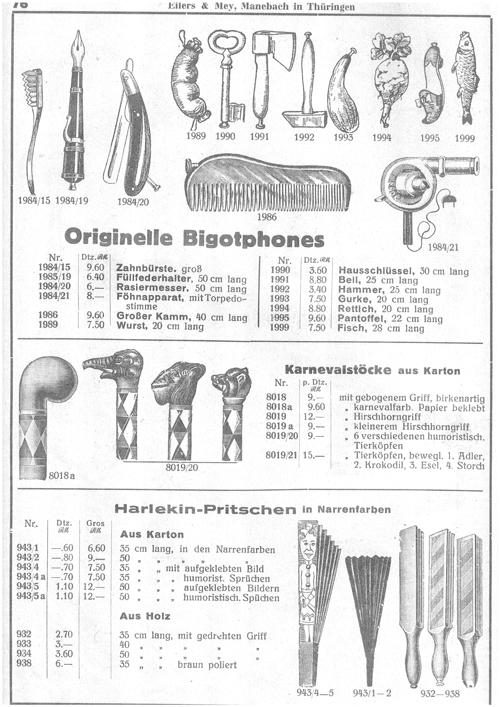 Eine Frage der Zeit war das Herüberschwappen des aus Blech, Holz und später auch aus Kunststoff gefertigten Instrumentes über den großen Teich in die alte Welt. Monsieur Bigot, war es, der ein Spieleerfinder aus Frankreich, 1883 nun auf die Idee kam, dieses kleine unscheinbare Teil in ein richtiges Instrument zu verwandeln bzw. bisher bereits gebräuchliche Blasinstrumente mit dieser Membran auszustatten. Instrumental wenig oder gar nicht ausgebildete Personen waren somit in der Lage, konzertant ihre Mitmenschen zu unterhalten. Insbesondere um 1900 erfreuten sich in Frankreich ganze Orchester großer Beliebtheit. Ohrenzeugen berichteten allerdings, dass man diesen „vielharmonischen“ Ohrenschmaus nur lieben oder hassen kann. Recht schnell entstand um 1900 auch in Deutschland der Bedarf an derart närrischen Instrumenten. Masken- und Scherzartikelhersteller, insbesondere aus den heutigen neuen Bundesländern, fertigten zunächst traditionelle, täuschend ähnliche Blasinstrumente aus Pappmaschee und Pappe. Selbst voll funktionierende Zugposaunen, vergoldet oder versilbert, aber auch Alphörner fehlten zum Beispiel 1904 nicht im Angebot des Kataloges der Maskenfabrik Eilers und Mey aus Manebach in Thüringen. Reichlich originell finden sich bereits im gleichen Katalog närrisch-fantasievolle Bigotphones. Träger dieser, den krächzenden Ton erzeugenden Membran waren allerdings Dinge des täglichen Alltages. So finden sich Bigotphones in Form von Küchengerätschaften, aber auch etwa als Schweinshaxe, Rettich, als Fisch oder Banane. Ersatzmembran oder aber auch Noten fehlten in dieser Ausgabe ebenfalls nicht. Im Katalog der gleichen Manufaktur aus dem Jahr 1930 lässt sich auch noch der Preis dieser papierenen musikalischen Erzeugnisse nachlesen. So kostete ein Dutzend Zugposaunen, geliefert wurde nur an Einzelhändler, 18 Reichsmark. Vergleichsweise günstig war ein Dutzend bespielbarer Kaffeemühlen zum Preis von 14,40 Reichsmark. Ein Stimmenhäutchen zur Reparatur defekt gewordener Stimmen kostete übrigens 1,20 Reichsmark. Ein historisches fotografisches Dokument aus den 1930er-Jahren aus Manebach zeigt in einem Verkaufsraum neben zahlreichen Masken in der oberen Bildhälfte auch einen Teil des Angebotes an Bigotphones. Vereinzelt tauchen heute noch Nachfahren der Bigotphones als Kinderspielzeug, häufig in Form eines kleinen Saxofone aus Kunststoff, teils gefüllt mit Zuckerperlen, insbesondere auf Messen und Jahrmärkten auf. Kazoos aus Kunststoff zum Beispiel sind heute noch regelmäßig im Musikalienhandel bereits zu einem Preis von etwa 1,50 Euro zu erhalten, und Sie gehören in aller Regel zum musikalischen Repertoire zahlreicher Straßenmusikanten. Fastnächtlich finden Kazoos heute noch zum Beispiel beim Ottmarsbocholter Karneval im Münsterland Verwendung. Beim Eiersammeln, bei welchem neben rohen Eiern auch Mettwürste gesammelt werden, dient dieses ungewöhnliche Instrument als musikalische Aufforderung an freigiebige Spender. Für den musikalischen Selbstversuch bietet die große Welt des Internets übrigens eine Bauanleitung zur Herstellung eines Kazoos aus Papier bzw. Karton. |