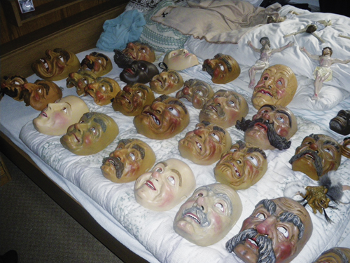 Wir werden schon erwartet. Seit sich der 62-jährige Gerhard Casari vor zwanzig Jahren scheiden ließ, lebt er mit seinem zwei Jahre älteren Bruder Ewald zusammen. „Kauzig“ seien sie, hat einer der vielen Fernsehberichte über die Brüder geurteilt. Doch der Schein trügt. Gerhard ist der Künstler, ein Schnitzer und Gestalter der Imster Fastnacht. Er ist einer, der den Gesichtern Leben einhaucht wie kaum ein anderer, während sein Bruder der Manager und Hausmann ist. Er kocht, putzt, wäscht, verhandelt mit den Larvenkäufern. Und gemeinsam bauen sie Wagen. Dafür hat Gerhard schon viele riesige Figuren geschnitzt. Di kenn i vum Fernsehn. Mir schaua oft Südwescht. Di hon i do schon gseha“, begrüßt mich Gerhard, der Schnitzer. „Jo, jo“, sagt sein Bruder, „di hon mr do scho gseha“. Freudig zeigt uns Gerhard seine sauber aufgeräumte Werkstatt, die sich in der ehemaligen ehelichen Wohnung befindet. Über und über sind alle freien Stellen der Zimmer mit unglaublich ästhetischen, ausdrucksstarken und lebendigen Masken belegt oder behangen. Selbst das frühere Ehebett – das nicht mehr gebraucht wird – ist mit den Masken bedeckt. „Larven“ heißen sie in Imst. Mundartlich korrekt „Lorva“. Dort finden sich die prächtigen und imposanten Schellerlarven mit den breiten, die Larve überschreitenden Bärten ebenso wie die zarten und sanft blickenden Rollermasken. Am beeindruckendsten aber sind die Charaktermasken, die für die Sackner, Labera und Kaminer geschnitzt sind. Halbmasken und bewegliche Masken, die aus drei Teilen zusammengefügt sind und nur aus Augen und Nase bestehen. Trotzdem machen sie den Träger völlig unkenntlich. Nur für die Katze bleibt ein kleiner Platz auf dem Bett. Offensichtlich fühlt sie sich zwischen all den bildhauerischen Kostbarkeiten wohl. Gerhard ist ein spätberufener Schnitzer. Eigentlich hat er den Beruf des Zimmermanns gelernt, verlor aber durch einen Arbeitsunfall ein Auge, sodass er sich etwas anderes als Broterwerb überlegen musste. Im, für eine Ausbildung schon fortgeschrittenen Alter von 40 Jahren, besuchte er also die Schnitzschule in Elbigenalp und erlernte den Beruf des Bildhauers. Dort steht traditionell auch das Maskenschnitzen auf dem Stundenplan. Aber nicht nur das, auch Anatomie und Stilkunde, Proportionslehre und Kunstgeschichte sog der eigenwillige Schnitzer wissbegierig in sich auf. Er schleudert sein mittlerweile profundes Wissen den Besuchern und Käufern seiner Masken geradezu entgegen. Es sprudelt nur so aus ihm heraus, wie ein nie endender Wasserfall. Zu jeder Larve kennt er eine Geschichte. Er redet von der Tiefe der Larve, vom Ausdruck, von der Unterlippe, die weiter zurückgesetzt sein muss als die Oberlippe, und von der Art und Weise, wie er seine Larven mit Öl fasst, also bemalt. Beständig wirbelt er durch die vollständig maskierte ehemalige Wohnung, zeigt Larven hier und dort, führt uns zwischen den Zimmern umher und begeistert sich selbst und seine Besucher für die Qualität seiner Masken. Casari weiß, was er kann und was seine Kunst wert ist. Allerdings hält er von den überzogenen Honoraren schwäbischer, oder besser gesagt: alemannischer „Schnitzergötter“ nicht viel. Aber er hält auch das Kopieren mit der Fräse für verwerflich. Wenn ein anderer Schnitzer seine Larven nachschnitzen will, dann leiht er gern mal eine aus. Aber Kopierfräsen, das geht nicht.