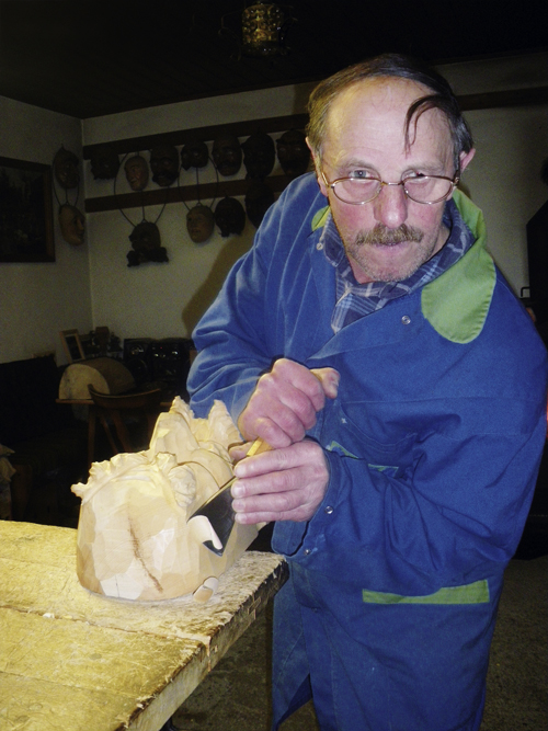 Und während Ewald sich eine Zigarette nach der anderen ansteckt, beginnt Gerhard zu schnitzen. Es ist wie ein Gebet, was er da macht. Langsam und bedächtig schabt das große breite Eisen Span um Span von dem groben Holzklotz, der kaum erahnen lässt, dass später mal eine feine Altfrankspritzerlarve daraus wird. Rund und runder wird der Holzklotz. Während eine sorgsam über das lichter werdende Haupt gekämmte Haarsträhne sich der Schwerkraft hingibt und den Anschein erweckt, die Schnitzarbeit genau verfolgen zu wollen, konzentriert sich Gerhard Casari auf sein Werk. Mit einer großen eisernen Stellschraube hat er den hellen und wohlriechenden Maskenblock aus Zirbenholz auf seinem Arbeitstisch festgeschraubt. So kommt er ringsum an die Maske und kann sie bearbeiten und gestalten. Es ist nicht nur ein einfaches Schnitzen einer Figur. Er haucht dem Holz Leben ein. Es scheint, dass ihm das Holz sagt, was aus ihm einmal werden soll, wo die Lachfalten, das Stirnrunzeln, der Tränensack aus dem Holz geholt werden wollen. Jeder Holzklotz scheint mit einen Faust-mäßigen Vertrag für die Bearbeitung durch Casari die Seele an ihn verkauft zu haben. Etwa eine Woche arbeitet Gerhard Casari an einer Larve. Drei Tage braucht er zum Schnitzen und zwei weitere Tage zum Fassen. So macht er etwa 20 Larven pro Jahr. Auch Krippenfiguren und Jesusfiguren verschaffen ihm und seinem Bruder Ewald ein ordentliches Auskommen. Sie sind nie als Scheller und Roller gegangen, die beiden. Aber 25 Jahre lang haben sie an den großen Festwagen der Imster Fastnacht mitgebaut. „Dies Johr isches ’s letscht Mol gwesn. Jetzt moch mr nimmr mit“, sagen die beiden übereinstimmend. Wir wollen es dennoch nicht so wirklich glauben. Eigentlich wollten wir nur auf einen Sprung vorbeischauen, und nun sind es doch gut drei Stunden geworden, in denen uns das wohlig-angenehme Gefühl beschlich, dass wir – soweit das in der kurzen Zeit geht – Freunde geworden sind. Gerhard begleitet uns zum Auto und wünscht uns alles Gute. „Kehrts bold amoll wieder zua! No trinkch mr a Glasl. Mir frein ins.“ Sagt’s und winkt uns wild gestikulierend mit beiden Händen nach, bis wir in der Mitte des Steilhanges um die Kurve biegen und uns gegenseitig aus den Augen verlieren – aber nur vorerst.