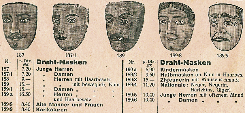 Im Jahre 1839 berichtet Fanny Hensel, ebenfalls hochbegabte Schwester des Komponisten Felix Mendelssohn Bartholdy, von ihren Erlebnissen beim römischen Karneval und dem dort wohl berüchtigten Hagel von Konfetti: „Die meisten Damen halten sich zu diesem Zweck Drahtmasken vor das Gesicht, da ich aber die Lorgnette brauche, kann ich dies Mittel nicht anwenden, sondern schütze mich durch den Schleier.“ Etwa ab 1880 fertigten in den südthüringischen Orten Manebach, Ohrdruf und Sonneberg mehrere Manufakturen mit einem Heer von Heimarbeitern neben Pappartikeln auch Drahtmasken für die Narren in aller Welt. Insbesondere die Firma Kochnitz aus Sonneberg spezialisierte sich auf Drahtmasken für den Export in die südamerikanischen Karnevalshochburgen. Klimatisch bedingt boten diese Masken zahlreiche Vorteile gegenüber den ebenfalls zu Hunderttausenden hergestellten Papierlarven der Thüringer. Einem Katalog der Firma Eilers und Mey in Manebach aus den 20er-Jahren lässt sich das reichhaltige Angebot von Drahtmasken explizit für den Großhandel entnehmen. Neben Masken, die junge Damen, Herren und Kinder zeigen, finden sich auch die „Zigeunerin“ oder „Neger“ und „Negerin“. Ein Dutzend junger Herren mit beweglichem Kinn kosteten 15 Reichsmark. Das Tragen von Drahtmasken lässt sich heute noch in einigen Zünften des deutschsprachigen Brauchgebietes in Österreich, der Schweiz und in einigen Narrenstädten der schwäbisch-alemannischen Fastnacht im deutschen Südwesten anschaulich verfolgen. Bemerkenswert bei den bereits genannten Schleichern aus Telfs sowie bei den Röllelibutzen in Altstätten ist die Aufwertung der relativ einfach gestalteten Drahtlarve durch prächtige Kopfbedeckungen. So tragen die Schleicher den kompletten Querschnitt bäuerlichen Lebens und Brauchtums, einen Mikrokosmos der Volkskunst auf dem Kopf. Die über einen Meter hohen und bis zu zwölf Kilogramm schweren Hüte sind der Stolz eines jeden Schleichers. Die Röllelibutzen in Altstätten im sanktgallischen Rheintal veredeln ihre Larve mit einem prächtigen Kopfputz aus Glasperlen, Strass, Blumen und Federn, stark erinnernd an die Schönperchten der Tiroler Fastnacht. Siebnen und Reichenburg in der March können ebenfalls eine drahtverlarvte Narrenfigur nachweisen. Das Fossli Begleiter des eher bekannten Rölli, trägt eine solche Maske; sein Häs erinnert sehr stark an den Bändelenarro aus Zell am Harmersbach.