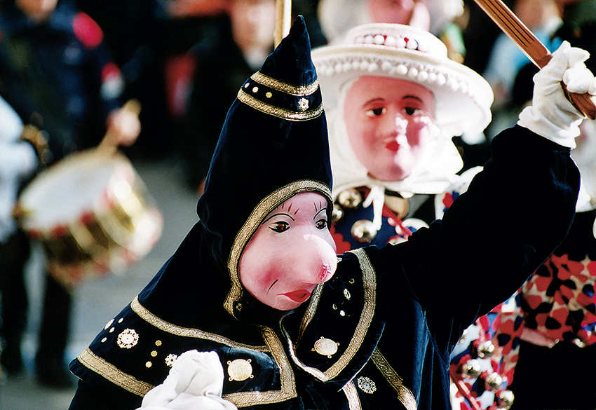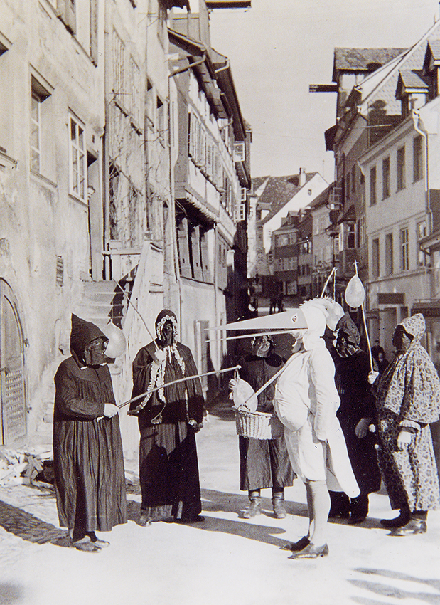 Eine der Masken, die im närrischen Treiben immer wieder anzutreffen war, hieß Domino. Der Domino war vor allem auf den Maskenbällen zu sehen, konnte man das Kostüm doch oft für wenig Geld in den lokalen Maskengarderoben ausleihen. Auch in der Straßenfastnacht begegnete man dem Domino hin und wieder. So wie noch heute in Haigerloch, wo die Dominos am Fasnetsdonnerstag die Schüler befreien. In Dominokostümen sind auch die Begleiter der Schnabelgiere in Meersburg unterwegs, wo einem Reisejournalisten schon Anfang des 19. Jahrhunderts die vielen venezianisch geprägten Masken aufgefallen waren. Und auch auf der Baar findet sich in Aasen noch ein Domino unter den Maskengestalten. Am stärksten verbreitet aber ist die Figur in der Innerschweiz – etwa im Klosterdorf Einsiedeln, in Schwyz oder Unterägeri. Hier trägt der Domino ein Kostüm aus dunkelfarbigem Samt mit leichtem Goldbesatz. Als Kopfbedeckung dient eine aufrecht stehende, gestopfte Kapuze mit über die Schultern hängendem Pelzoberteil. Bei den Schwyzer Nüsslern gilt der Domino, der dort „das“ Domino heißt, nach Definition der Zunft als „wild-wirblig“, aber auch als der typische Intrigant und verschlagene „Schleicher“. Sein Äußeres aber würde heute kaum noch jemand mit den einfachen Mönchsgewändern von einst in Verbindung bringen. So trägt das Domino bei den Nüsslern zu weißen Stulpen ein bis unter die Knie reichendes, einfarbiges Samtkleid in Rot, Blau, Grün oder Schwarz. In der Regel ist es mit großen farbigen Blättern verziert und mit Gold- oder Silberstreifen gefasst. Die spitze Kapuze mit Schulterkragen ist ausgestopft. Außerdem gibt es in der Stadt gleich zwei verschiedene Domino-Larven: ein freundliches Mädchengesicht mit schwarzer Nasen-, Augen- und Stirnpartie – und eine plumpe Maske mit roter Knollennase.