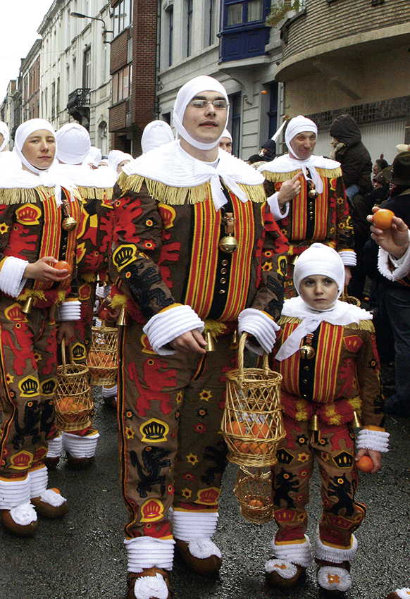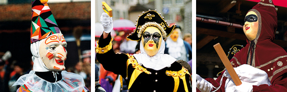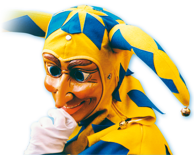 | Bajass und Domino von Günter Schenk Auf den ersten Blick scheinen sie so gar nicht zu den wilden Gestaltenschwäbisch-alemannischer Fastnacht zu passen. Neben Teufeln, Hexen und anderen Schreckgestalten nehmen sich Domino oder Bajass recht zahm aus. Beide aber haben eine lange Fastnachtstradition, die bis ins 18. Jahrhundert zurückreicht. Und beide fanden den Weg aus Italien zu uns. Der Domino als eine bequeme Masken- kleidung, wie man sie besonders gern im venezianischen Karneval trug. Der Bajass oder Bajazzo über die Commedia dell’Arte, zu deren lustigmachenden Figuren er gehörte. In den Stadtfarben Blau und Gelb springt der Bajass durch das Schwarzwald-Städtchen Waldkirch. Zu Hunderten gleich, nicht als Einzelfigur wie in der hessischen Fastnachtshochburg Herbstein, wo der Bajazz die närrische Schar beim traditionellen Springerzug anführt. Besonders beliebt ist der Bajazz auch in der Innerschweiz, wo er als Bajazzo-Buob und Bajazzo-Meitli unterwegs ist, das vermutlich gegen Ende des 19. Jahrhunderts als Ergänzung zum männlichen Spaßmacher geschaffen wurde. In Mainz ist der Bajazz seit eineinhalb Jahrhunderten Aushängeschild des traditionsreichen Mainzer Carnevalvereins, der mit der Figur in Anzeigen, Liederheften oder Umzugsprogrammen für die Fastnacht wirbt. Und auch die Mainzer Hofsänger, die bekannteste der närrischen Sangestruppen im Land, stecken im Bajazzkostüm. Am bekanntesten aber machte die Narrenfigur ein promovierter Zahnarzt, der als „Bajazz mit der Laterne“ in den 1950er- und 1960er-Jahren vor Millionen Fernsehzuschauern den Politikern die Leviten las. Während der Mainzer „Bajazz mit der Laterne“ oft ganz klassisch im weißen Narrenkleid und mit Halskrause in Erscheinung trat, steckt der Bajass von Waldkirch im blau-gelben Schellenkleid. Als Narrenschwert trägt er eine Pritsche, an der vor allem die jüngsten Bajasse in Waldkirch ihren Spaß haben. Narrenzepter und Krone dagegen führt der Bajazz in Herbstein ins närrische Feld, dessen Tracht Tiroler Einflüsse prägen. So vielfältig wie die Figur sich heute präsentiert, so bunt ist auch ihre Geschichte. Denn hinter dem Bajazz steckt ein italienischer Theaterheld. Eine Figur aus der Commedia dell’Arte, die einst als Pagliaccio von sich reden machte. Der Pagliaccio entstammt der zweiten Hälfte des 16. Jahrhunderts und gehört zur Familie der Pierrots, aus der auch Gilles und Paillasse stammen. Zwei der wichtigsten Fastnachtsfiguren Belgiens und Südfrankreichs. So ist der Gilles noch heute die närrische Hauptfigur in der Wallonie, der Paillasse der Held im närrischen Spiel von Cournonterral. Dort attackiert er am Aschermittwoch den ganz in Weiß gekleideten Blanc, dem er mit schmutzigen Lappen Flecken auf Hemd und Hose, vor allem aber im Gesicht verpasst.
