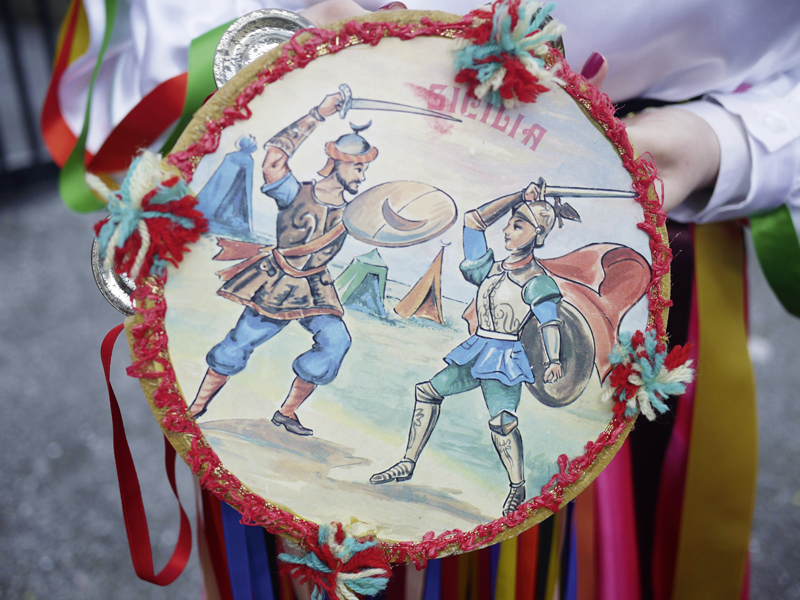 Gegen halb drei soll der Umzug beginnen, doch erst eine Stunde später kommen die Narren langsam in die Gänge. Ein Gendarm sorgt für Ordnung, schleust hin und wieder ein Auto an den Narren vorbei, die unter Akkordeonklängen von San Filippo del Mela nach Cattafi ziehen. „Scacciuni“ heißen die närrischen Helden hier. Weiße Narrenkleider tragen sie und hohe weiße Hüte, an denen bunte Bänder hängen. Figuren, die auch aus der schwäbisch-alemannischen oder alpinen Fastnacht stammen könnten. In den Augen der Einheimischen verkörpern sie die Türken, welche die Bauern hier einst mit Dreschflegeln gleich nach deren Invasion vertrieben hätten. Wahrscheinlicher freilich ist, dass sich hier ein alter Karnevalsbrauch erhalten hat, wie er sonst in Sizilien längst ausgestorben ist: ein närrischer Hochzeitszug, wie man ihm vom Balkan bis ins Baskenland an den Tagen vor Aschermittwoch begegnet. Und wie überall steht auch hier die Welt kopf, kommen die Männer in Frauenkleidern, tragen die Frauen stolz ihre aufgeklebten oder aufgemalten Bärte. Zwei Bewaffnete führen den Zug an. Gelbe Mimosen stecken im Lauf ihrer Gewehre, Blumen wie bei den rheinischen Karnevalsgarden. Ab und zu werden Konfettisalven gefeuert, zieht die närrische Gesellschaft von einer zur nächsten Kneipe. Fast ganz ohne Zuschauer kommt man hier aus, ist Fastnacht kein Event oder eine Sache zum Staunen, sondern traditionell gelebter Alltag.