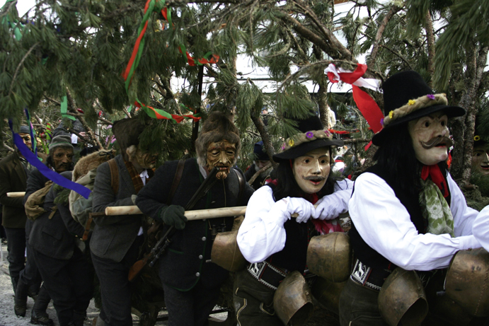 „Iatz geats lous, iatz springa d’Schallner.“ Im geübten Gleichschritt hüpfen die Burschen in ihren Lederhosen durch die Gassen. Schwere Schellen haben sie umgeschnallt, die lautstark für den Auftakt sorgen. Blickfang freilich ist der Bajazz im rot-gelben Narrenkleid. „Bajatzl“ nennen ihn die Einheimischen. Wie ein Derwisch fegt er vom einen zum anderen Hof. Springt artistisch von Dach zu Dach, so waghalsig oft, dass manchem Betrachter der Atem stockt. Mit Händen und Füßen kehrt er den Schnee von den Häusern. So, als gelte es, ganz schnell dem Frühling Platz zu schaffen. „Hüo!“ Mit der Peitsche bringt der Fuhrmann den Bloch schließlich in Fahrt, einen meterlangen Baumstamm, den größten Zirbenbaum, den die Gemeinde auftreiben konnte. Schritt für Schritt geht es durchs Dorf, obenauf die Oberhexe in ihrem Bretterverschlag. Hinten sorgt ein Harmonikaspieler für gute Laune, macht Musik für die maskierten Männer vor dem Schlitten, die das tonnenschwere Gefährt manch steiles Gässchen hinaufwuchten müssen.
